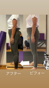 立位は左がアフター。姿勢が改善されています。  右写真は、右がアフター。股関節が開く様になっています。